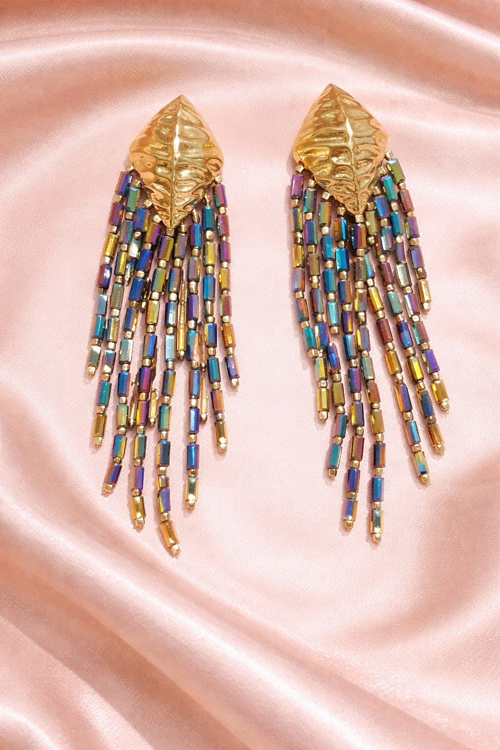 Make a bold and elegant statement with these stunning fringe earrings, designed to capture light and attention from every angle. Featuring a beautifully textured gold-tone leaf top, these earrings bring a touch of nature-inspired sophistication to your look.