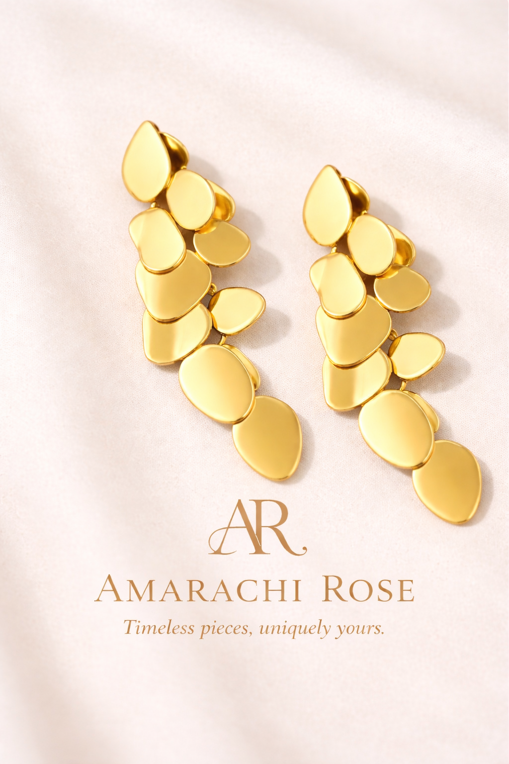 Elegant and eye-catching, these gold-tone statement earrings feature a cascading design of smooth, organic shapes that catch the light beautifully. Perfect for elevating both everyday outfits and special occasions.